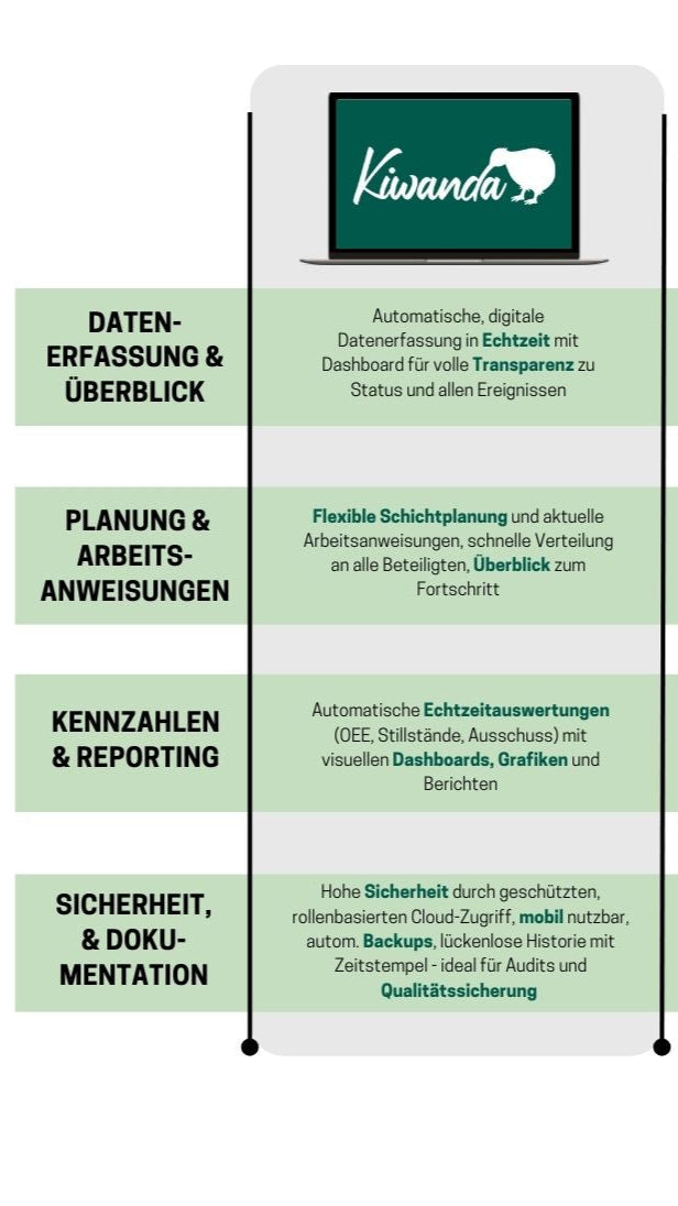 Endlich eine unkomplizierte Software zur Steuerung, Überwachung und Optimierung von Produktionsprozessen: Behalten Sie den Status Ihrer Maschinen, Produktionsmengen und Fehlerquellen im Blick. Planen Sie Ihre Produktionsprozesse und identifizieren gezielt Verbesserungspotenziale. Kiwanda ist das digitale Cockpit für mehr Transparenz, Sicherheit und Effizienz – speziell für kleine und mittelgroße Fertigungsbetriebe. Machen Sie Ihre Fertigung fit!